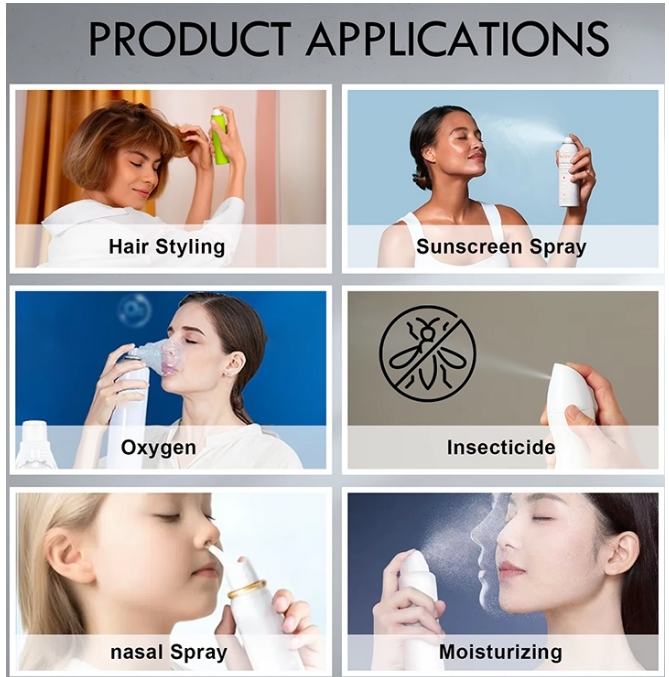 3-Applied to various products, such as shaving foam,hair spray,deodorant spray, air freshener, cooking oil spray, spray paint, cleaning agent spray, butane gas, anti-mosquito spray, cooling spray etc.